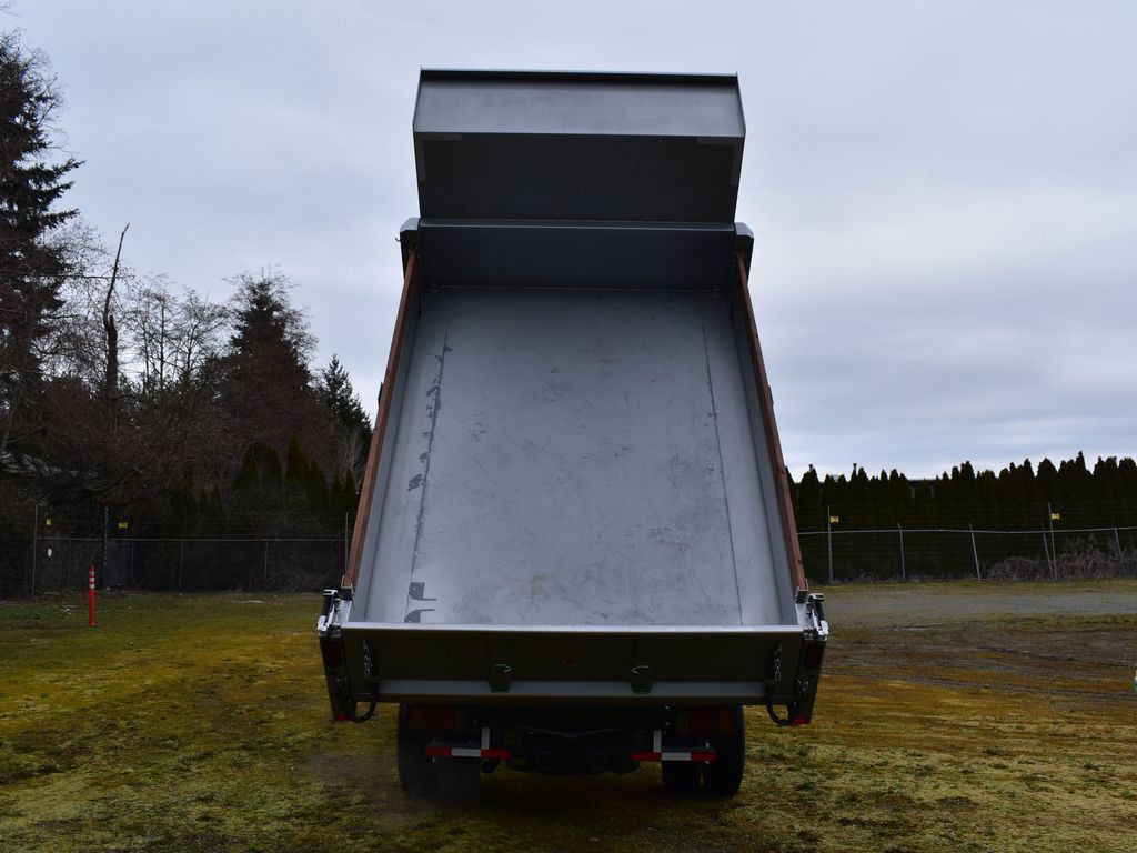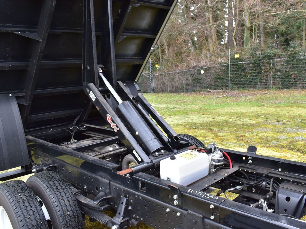 The truck features a compact 109-inch wheelbase, making it easy to maneuver in tight spaces while maintaining a 12,000 lb GVWR. The dump body includes fold-down sides on both sides for flexible loading and unloading, along with a 2-inch square receiver hitch for added utility.